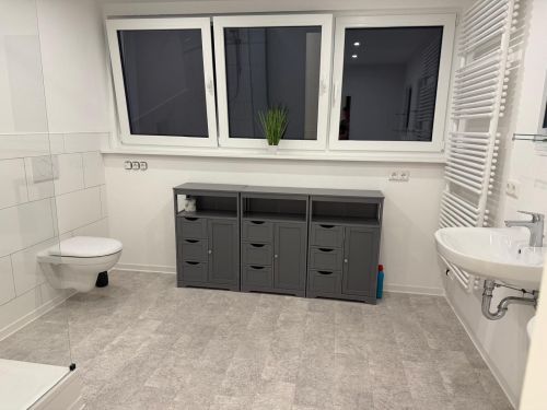 Gemeinschaftsflächen: Flur (Laminat hell, 7,4 m²/3 = 2,4 m²), Gemeinschaftsbad mit großer Dusche, WC und Doppelwaschbecken, elektr. Rolläden, sowie einem der Wohnung zugeteilten Badezimmerschrank (PVC hell, 8,5 m²/3 = 2,8 m² ), zusätzliches Gemeinschafts-WC (Laminat, hell, 1,8 m²/3 = 0,6 m²), Waschküche mit mietfreier Waschmaschine (12 m²/3 = 1,4 m²), Trockenplatz, alles im DG.