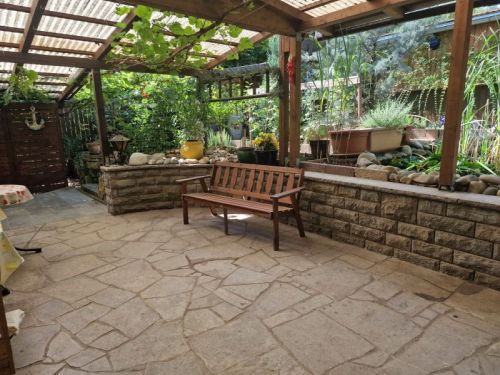 Bad mit Wanne, ebenerdiger Dusche + WC und 2 Waschbecken, Schlafzimmer (PVC), großer Balkon (Fliesen), riesige Terrasse mit Markise,