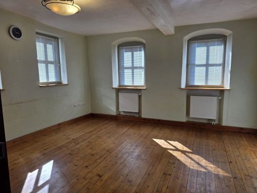 Obergeschoss: großer Flur, überall Holzdielen, Wohnzimmer, Schlafzimmer, Kinderzimmer, Bad mit Wanne, separater Dusche und WC, kleiner Raum mit Warmwasserspeicher